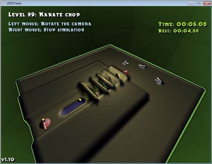 | Description: | This is an entry for the 10th bi-annual Ludum Dare LD48h game programming competition. The point is to make as good a game as you can in 48 hours, alone. I think I did pretty well this time, though I didn’t get much sleep. :) The theme for the competition was chain reaction. LD10Tanks is a game where you set up a field with cannons. You can move some cannons and you can rotate them all. Then you start the chain reaction by shooting one cannon. If a bullet hits another cannon, it fires too. The objective is to have every cannon shoot all their bullets in one big chain reaction. Also if a bullet hits a wall, it will destroy a part of it. Each level has a high score for your best time. Some technical details (more in the included Readme.txt file). All the meshes are generated using constructive solid geometry (CSG). A mathematical model is generated (currently out of spheres, boxes and cones/cylinders) describing the whole world. The a marching cubes algorithm is ran over the model to teseslate the scene geometry. This allows for deformable meshes, such as the terrain here (some volumes are solid, some are cutting volumes). I also wanted to try some sort of fancy post processing filer, and I came up with this fake fake-SSAO (ScreenSpace Ambient Occlusion). The basic idea was taken from some forum (found by google). I basically estimate the ambient term on each pixel by comparing the depth at the pixel with the blurred depth at the same pixel (so I blur the depth field). It’s not perfect, but for example on this screenshot you can see some nice shading in the small holes. I also made a level editor in .NET 2.0 (C#) and used that to craft these levels. The level editor is included in the package. |