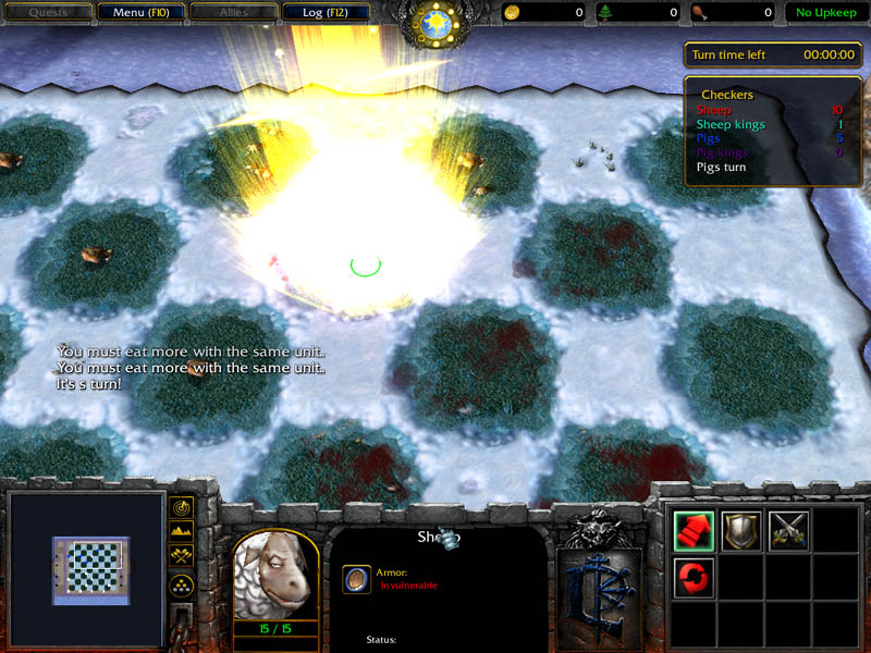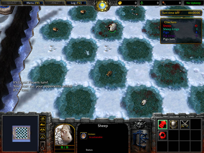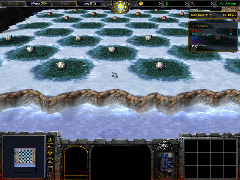 | Description: | Map for Warcraft 3 which turn the game into 2 player checkers. The game is completely implemented with map triggers. Both players must be human. This map was created for a Blizzard Warcraft 3 map contest. |
